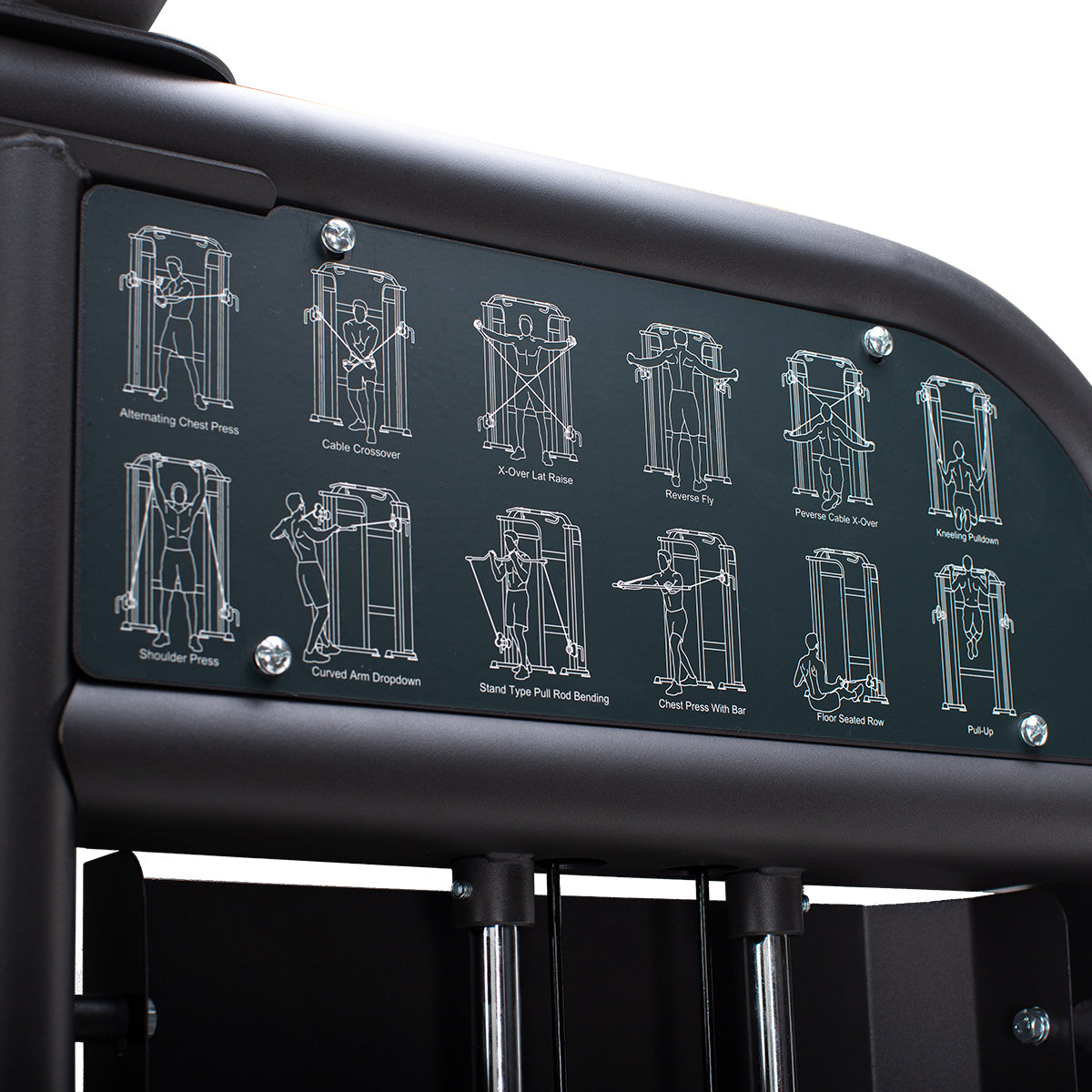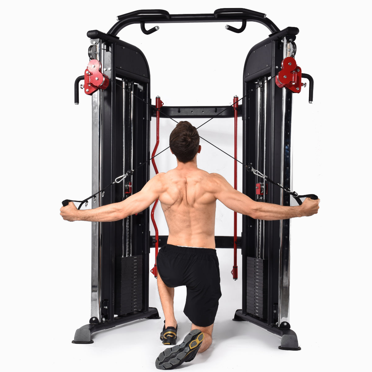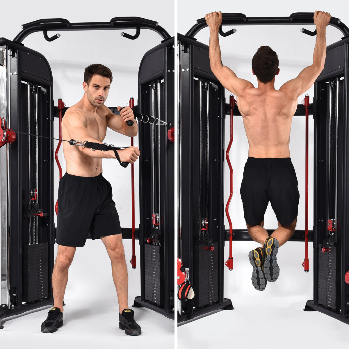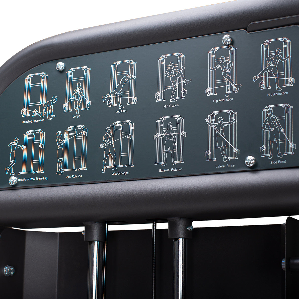 Forma ergonomică asigură un spațiu confortabil de antrenament, fie că folosești un singur scripete, fie ambele simultan.