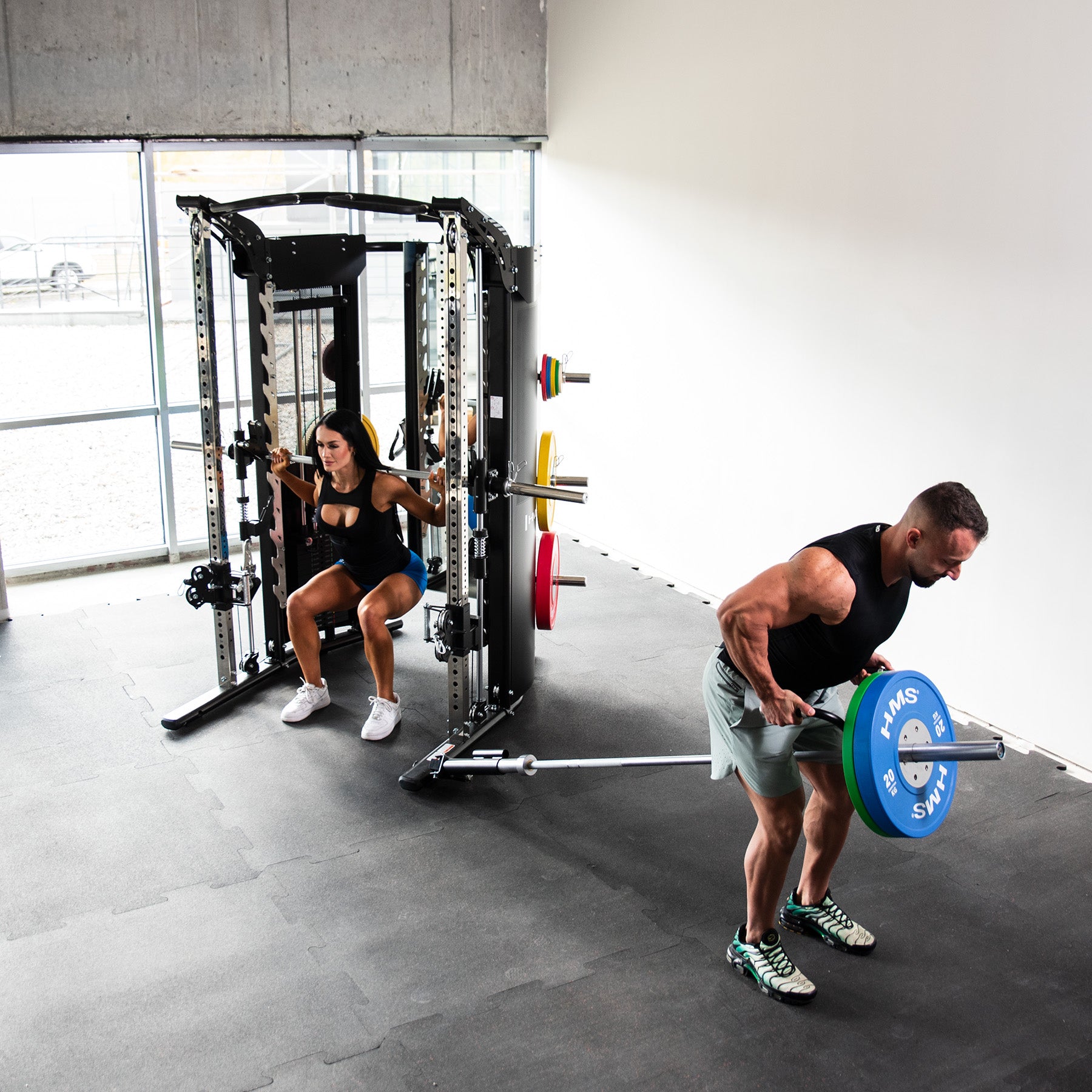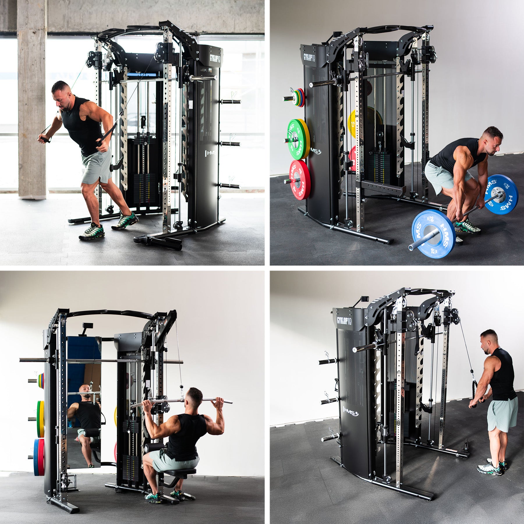 HMS CYKLOP 10 este o stație de antrenament avansată de tip 3-în-1, care combină o Smith Machine, un Power Rack și un Crossover / Functional Trainer într-un singur echipament compact. Cu două coloane de greutăți independente de 2 × 90 kg și un sistem inteligent care conectează bara Smith la coloane, poți alege între antrenamente cu greutăți libere, cu blocurile de greutate sau o combinație a ambelor. O singură stație care înlocuiește jumătate dintr-o sală de fitness complet echipată.