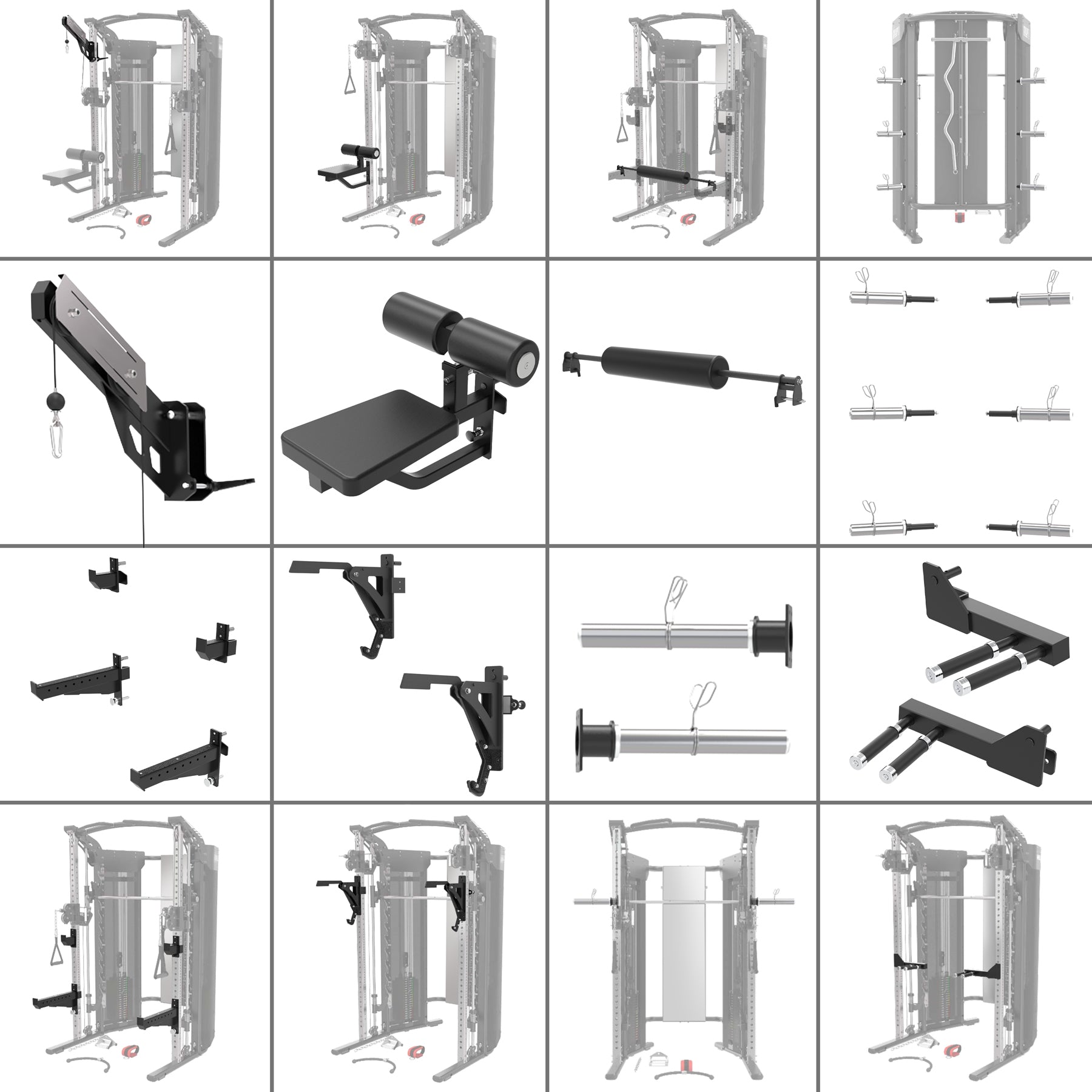 Suporturile integrate pentru accesorii și discuri de greutate mențin spațiul curat și organizat, facilitând accesul rapid la toate componentele.
