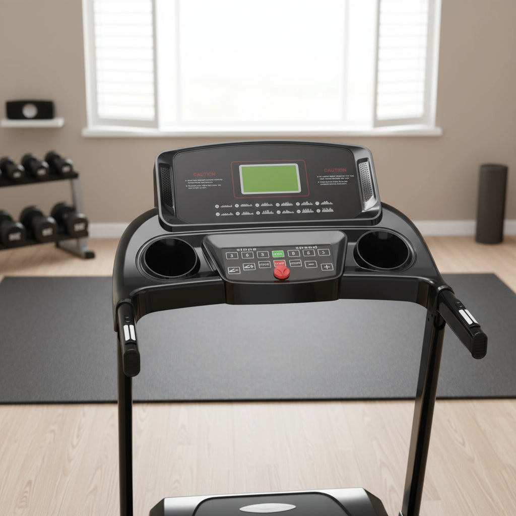 Consola LED afișează clar timpul, viteza, distanța, caloriile și pulsul, iar cheia de siguranță oprește imediat banda în caz de nevoie.