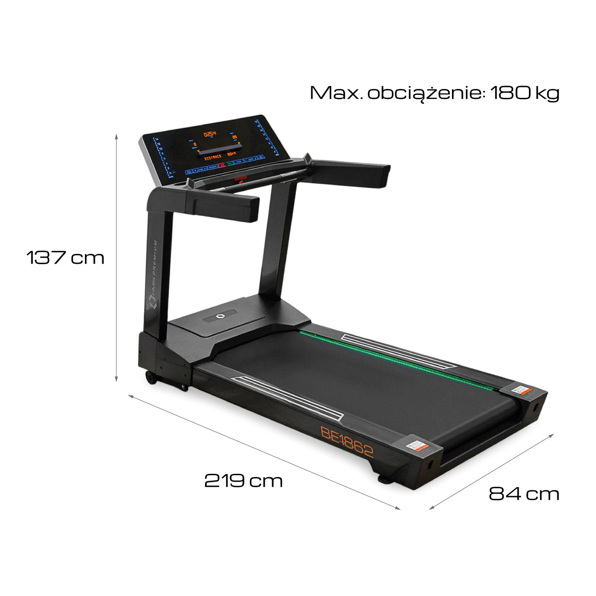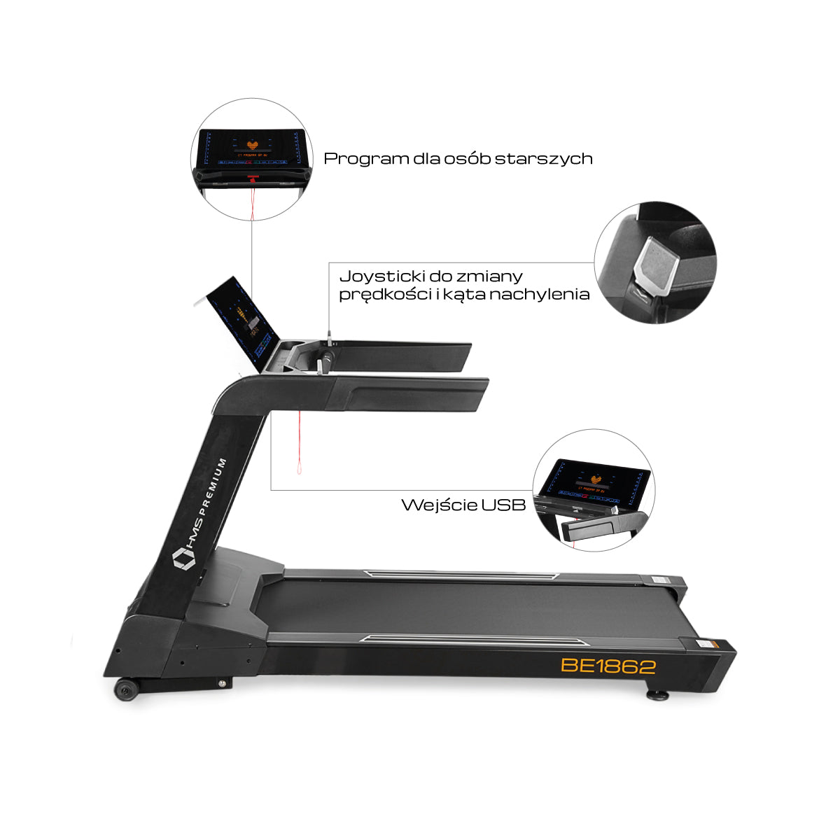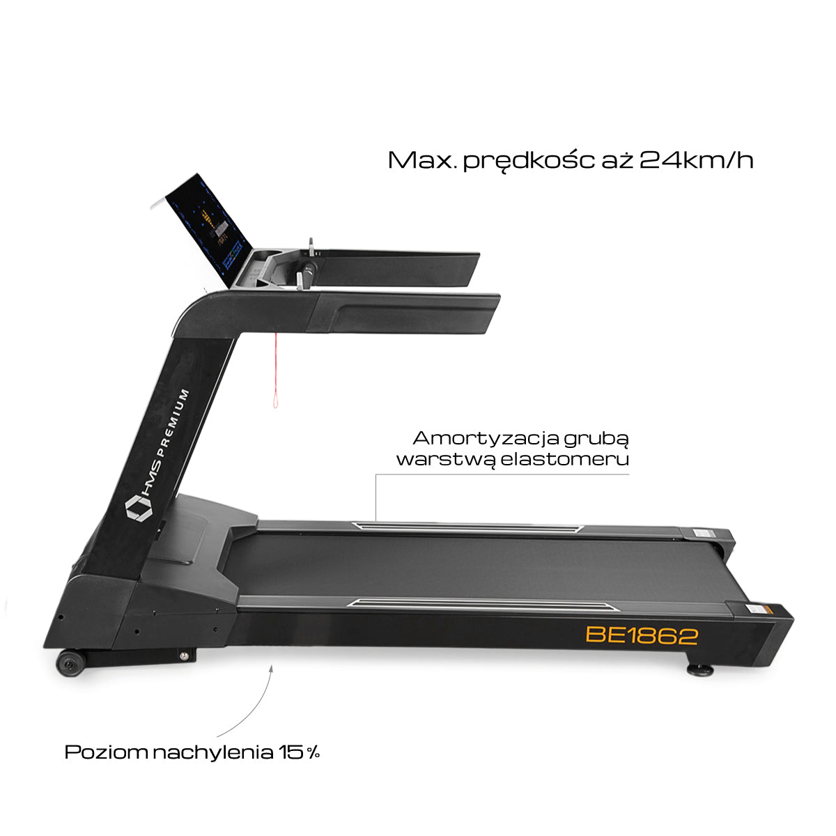BE1862 HMS PREMIUM este o bandă de alergare din clasa SEMI-COMERCIAL, concepută pentru cluburi mici de fitness.
