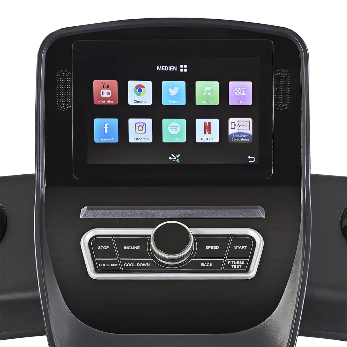 Cu pachetul multimedia complet si consola centrala Android cu ecran tactil, esti conectat permanent la lumea fitness-ului chiar si in timpul antrenamentului si vei lasa o impresie de durata. Suprafata de alergare extra-larga iti ofera siguranta necesara, iar comenzile „one-touch” iti permit sa ajustezi intensitatea antrenamentului printr-o simpla atingere. O banda de alergare de inalta performanta – conceputa pentru a scoate ce e mai bun din tine!