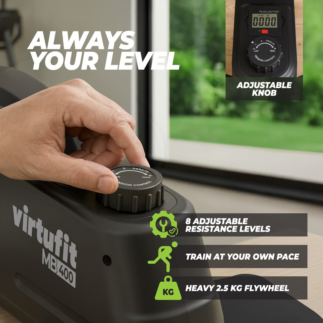 Descriere produsVirtuFit MB400 Chair Bike îmbină un design compact și portabil cu o utilizare extrem de simplă. Fie că vrei să rămâi activ acasă, la birou sau în perioada de recuperare, această bicicletă pentru scaun oferă o soluție accesibilă pentru îmbunătățirea sănătății și stării de bine. Datorită dimensiunilor reduse și operării intuitive, MB400 este potrivită pentru oricine, indiferent de obiectiv sau locație. VirtuFit MB400 – pe scurt