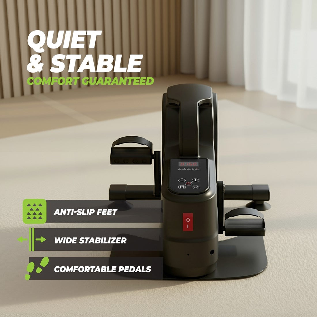 Avantajele bicicletei MB450VirtuFit MB450 este o alegere versatilă și accesibilă pentru îmbunătățirea sănătății și mobilității. Datorită asistenței electrice, pedalele se mișcă automat, fără efort fizic din partea utilizatorului. Designul compact și portabil o face o alternativă practică la aparatele fitness voluminoase, oferind în același timp beneficii reale pentru sănătate și stare de bine. Compactă, versatilă și ușor de folositRămâi activ fără efort cu VirtuFit MB450, o bicicletă electrică ce permite antrenarea picioarelor și brațelor. Cu 12 niveluri de asistență și 5 programe, poți regla rapid intensitatea în funcție de nevoile tale. Display-ul clar afișează timpul, viteza, programul selectat și numărul de rotații, pentru o monitorizare precisă a progresului. Pentru confort și siguranță suplimentare, MB450 este echipată cu pedale reglabile cu prindere Velcro, menținând picioarele sau mâinile ferm poziționate în timpul exercițiilor. Stabilizatorul lat și picioarele antiderapante oferă aderență excelentă, astfel încât te poți antrena în siguranță și confort, oriunde te-ai afla. Susține recuperarea, sănătatea și mobilitateaMB450 stimulează circulația sanguină și ajută la prevenirea rigidității. Este ideală pentru persoanele care stau mult timp jos sau au nevoie de suport suplimentar pentru mișcare. Asistența electrică reduce stresul asupra articulațiilor, permițând un antrenament controlat și prietenos cu articulațiile. Astfel, MB450 este perfectă pentru recuperare, întărirea sănătății articulare și menținerea unui stil de viață activ — fie că te recuperezi după o accidentare, fie că vrei să rămâi în formă și plin de energie. VirtuFitBrandul olandez VirtuFit garantează calitate excelentă. Echipamentele și accesoriile sunt realizate din materiale de înaltă calitate, cu accent pe ușurința în utilizare, design și funcționalități extinse. Cu VirtuFit alegi durabilitate și fiabilitate.