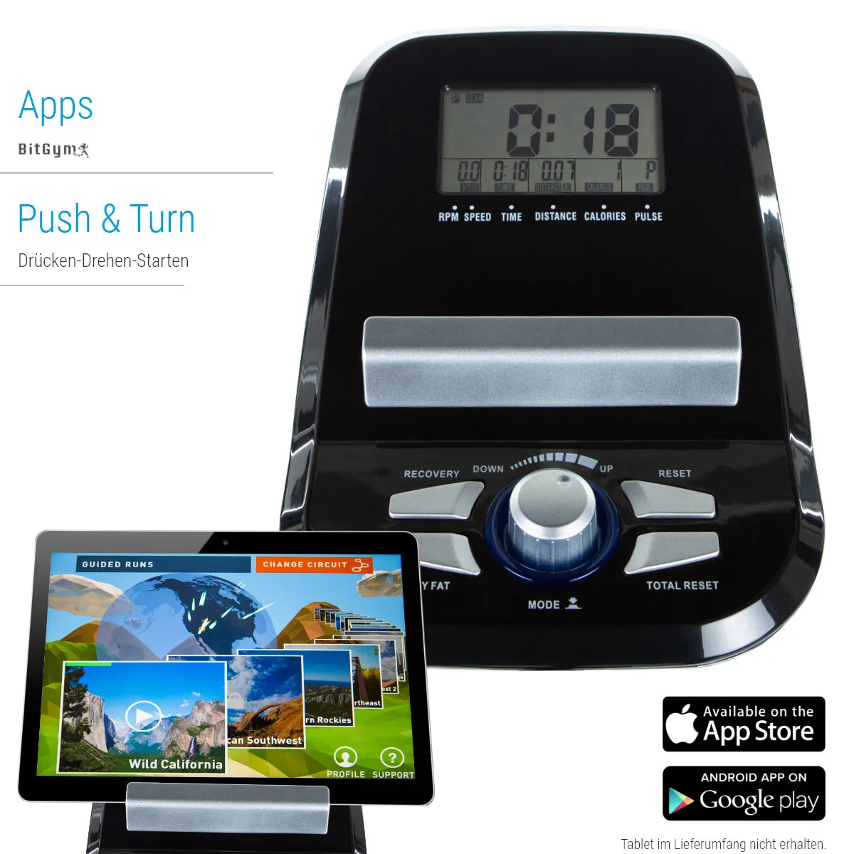 Cardio T3 este centrul tău multimedia: aplicația BitGym (cu cameră) îți oferă plimbări prin munți sau peisaje spectaculoase. Viteza de pedalare se adaptează în timp real la cadența ta pentru o experiență realistă. Alternativ, urmărești filme sau muzică — suportul integrat pentru tabletă/telefon ține totul stabil.