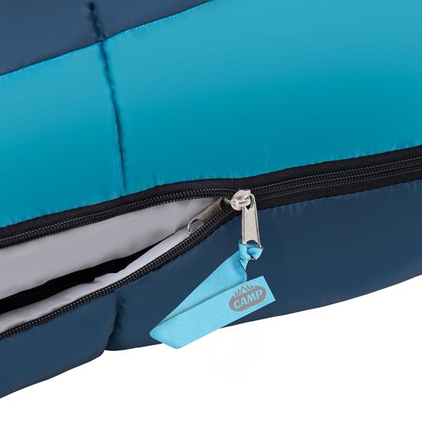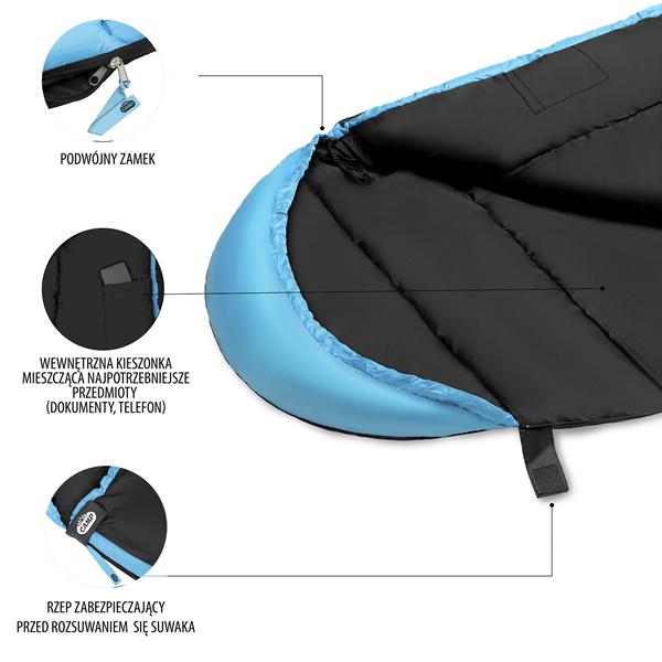 Pentru un plus de confort, sacul de dormit are cusaturi speciale care previn deplasarea umpluturii. Gluga din partea superioara este prevazuta cu snururi, asigurand stabilitatea pernei. Inchiderea se face cu fermoar, iar carligele si benzile velcro din partea inferioara impiedica deschiderea accidentala. Fermoarul este dublu, ceea ce permite deschiderea si din interior.
