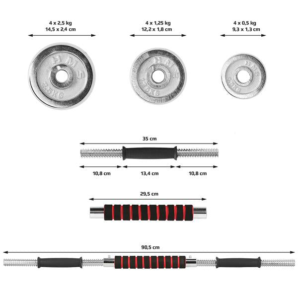 Setul include | 2 Bare scurte 1 Sistem de cuplare bare 4 Greutati 2,5 kg 4 Greutati 1,25 kg 4 Greutati 0,5 kg 4 Cleme |