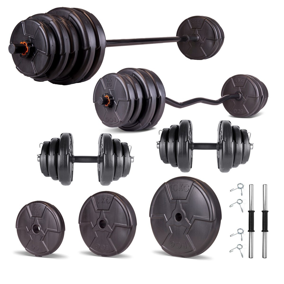 Bare scurte (40 cm) pentru gantere individuale – perfecte pentru exerciții de izolare și control. Bară lungă (120–150 cm, dreaptă sau tip Z) pentru haltere – ideală pentru antrenamente compuse, cum ar fi genuflexiuni, împins la piept sau ramat. Cleme de siguranță pentru stabilitate și antrenamente fără griji.