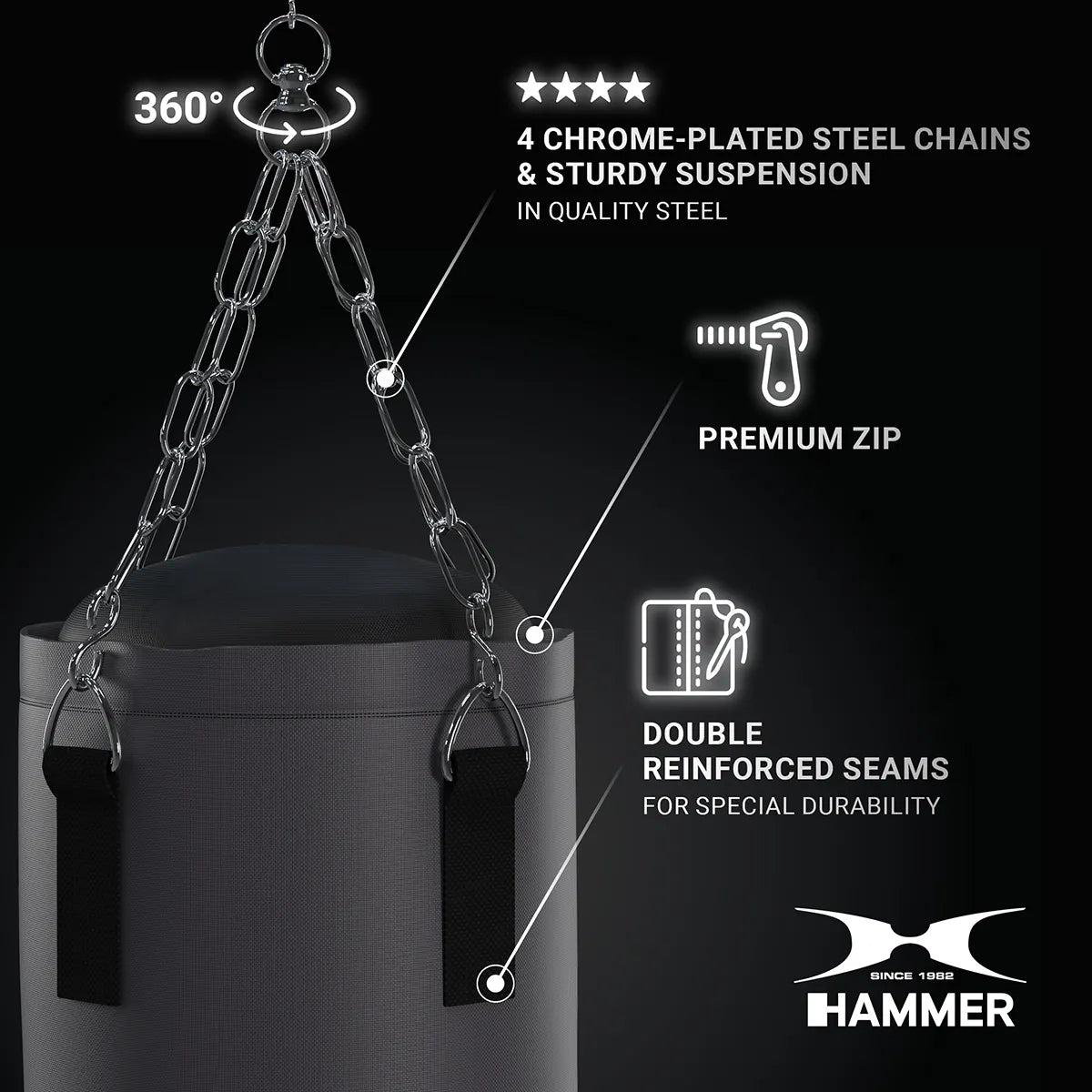 Sistem de prindere: 4 lanturi din otel (cromate), prindere stabila din otel, pivot (swivel) pentru a preveni rasucirea