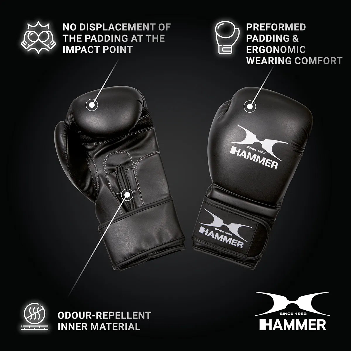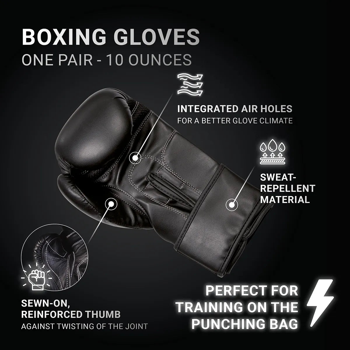 Manusile de antrenament sunt realizate din material PU si includ multe dintre caracteristicile manusilor din clasa premium: perna precurbata, forma ergonomica, degete mari cusute, gauri de aer si sistem de prindere cu arici pentru stabilizarea incheieturilor.