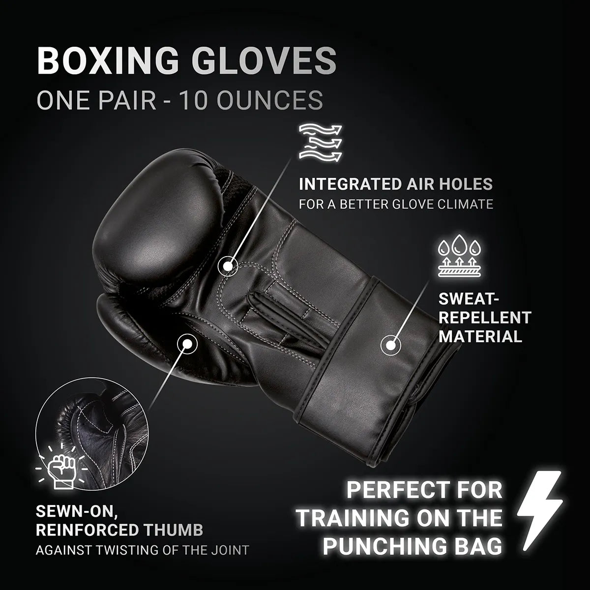 Manusile de box incluse, de 10 oz, sunt fabricate din material PU prietenos cu pielea si sunt perfecte pentru antrenamentele de sparring in propriul studio de box de acasa! Captuseala confortabila este potrivita si pentru combinatii mai dure de lovituri. Degetul mare este cusut pentru stabilitate, iar gaurile de ventilatie ajuta la absorbtia transpiratiei. Setul contine si un DVD de antrenament care te ajuta sa inveti rapid si in siguranta toate tehnicile de box.