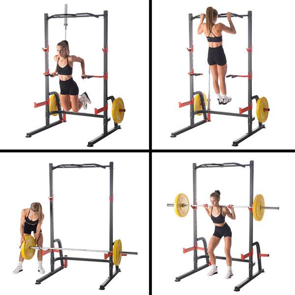 DescriereStandul multifunctional PWS08 este un stand de antrenament multifunctional fabricat de HMS. Standul este echipat cu un suport pentru haltere si carlige de asigurare. Prin urmare, se pot efectua in siguranta si independent antrenamente de forta cu greutate suplimentara , in timp ce bara si balustradele pot fi utilizate pentru a se antrena calistenic , adica exercitii cu propria greutate corporala. De asemenea, balustradele pot fi utilizate atunci cand se fac exercitii cu o banca de greutati. Balustradele, suporturile pentru haltere si carligele de asigurare sunt reglabile in ceea ce priveste inaltimea. Exact la inaltimea pe care o doritiSistemul usor de utilizat de reglare a inaltimii in 14 pozitii pentru manere, balustrade si carlige face ca cineva sa poata personaliza complet standul in functie de nevoile sale. Structura solidaDesignul PWS08 este un avantaj - structura groasa din otel va permite sa lucrati cu sarcini de pana la 200 kg. Suporturi pentru greutatiStandul este echipat cu carlige suplimentare pentru depozitarea greutatilor si un suport pentru o bara. Acestea faciliteaza mentinerea ordinii in sala, reduc spatiul ocupat de echipament si faciliteaza schimbarea incarcaturii halterei. Balustrade si baraPWS08 are balustrade duble exceptional de bine gandite. Balustradele duble permit ajustarea latimii de plasare a mainilor, astfel incat se pot antrena mai multe grupe musculare. Bara de curl permite antrenarea cu 4 prinderi diferite. Siguranta si confortPodelele salii de sport de acasa sunt adesea acoperite cu panouri sau placi. Din acest motiv, PWS08 vine cu patru tampoane mari de cauciuc pentru a asigura stabilitatea si siguranta. Toate suruburile proeminente sunt prevazute cu dopuri. Asamblare simplaIntregul kit vine in doua pachete care contin tot ce este necesar pentru asamblare (cheie, suruburi, capace si dopuri) impreuna cu instructiuni clare in limba poloneza. Timpul necesar pentru asamblare pentru o persoana este de aproximativ 15 minute. ExercitiiCu ajutorul standului se pot efectua exercitii care implica aproape toate grupele musculare majore: