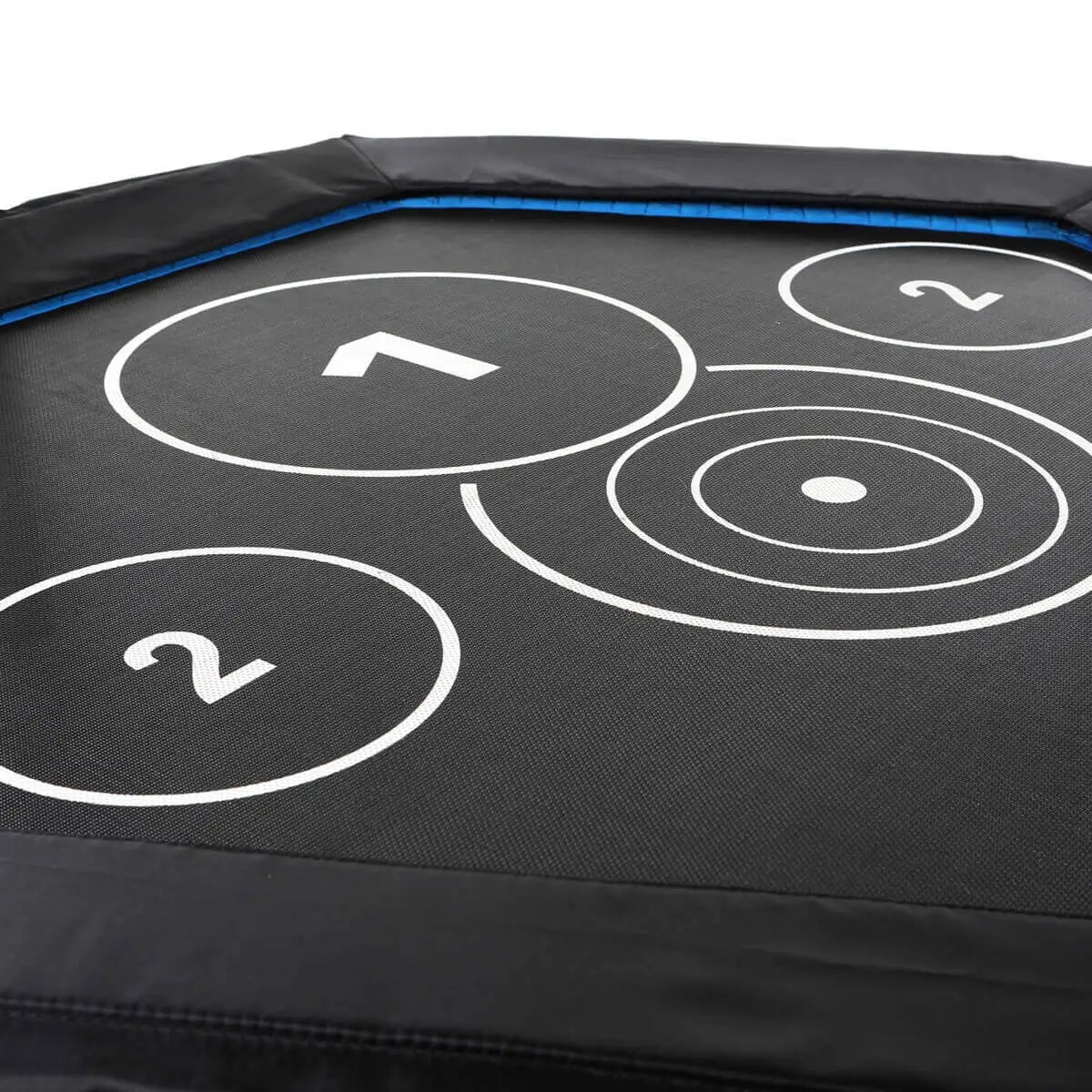 Punctele de saritura patentate de pe trambulinele HAMMER Cross Jump ofera stimulul perfect de antrenament si asigura faptul ca antrenamentul tau de sarituri este deosebit de eficient. Spre deosebire de trambulinele conventionale, marcajele circulare permit o secventa perfecta a exercitiilor si o coregrafie de antrenament precisa. Combinatiile de pasi perfect coordonate pe punctele de saritura permit o ardere de calorii deosebit de ridicata si, astfel, un succes rapid in antrenament.