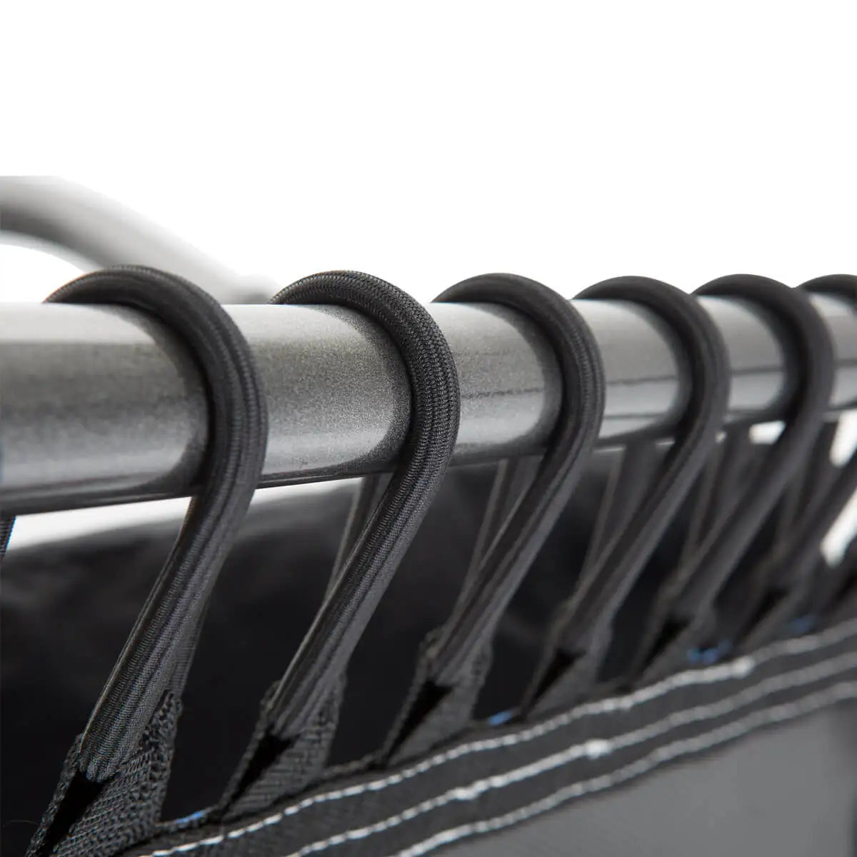 Benzile elastice premium ElastoPro asigura o intindere deosebit de puternica si uniforma, permitand intensitati de antrenament extrem de ridicate. Astfel, poti fi sigur ca te vei bucura de HAMMER Cross Jump pentru o perioada foarte lunga, deoarece atat corzile elastice, cat si salteaua de sarit au trecut cu succes un test de anduranta de peste 200.000 de repetari ale sariturilor. Bucla individuala cusuta in cruce poate rezista chiar si la clase de greutate corporala mai mare. Calitate autentica HAMMER pentru cele mai inalte cerinte si siguranta!
