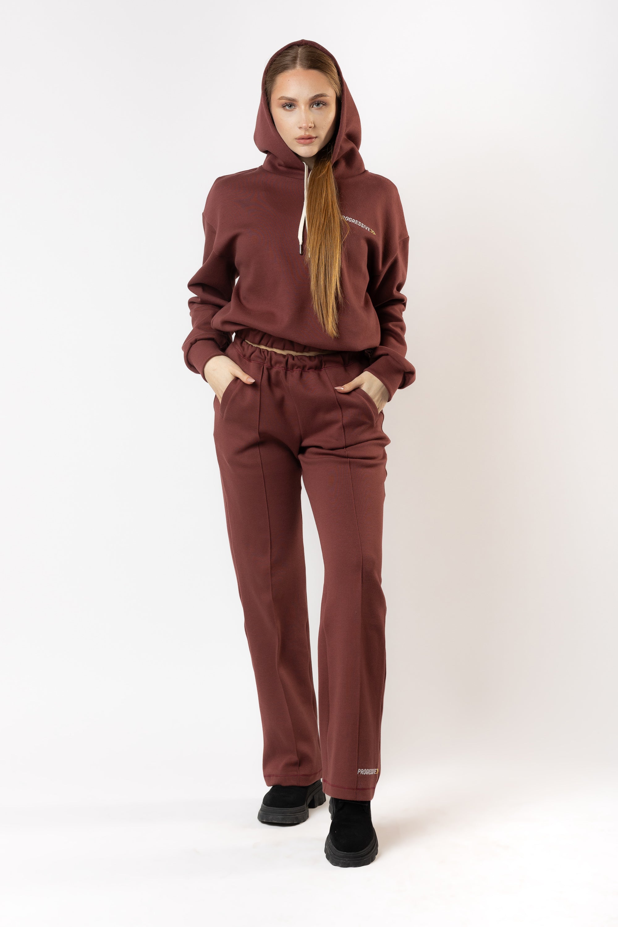Pantalonii evazați cu nervură pe mijloc și hanoracul cu glugă reprezintă o combinație trendy și atrăgătoare, care te va face să ieși în evidență în orice context.